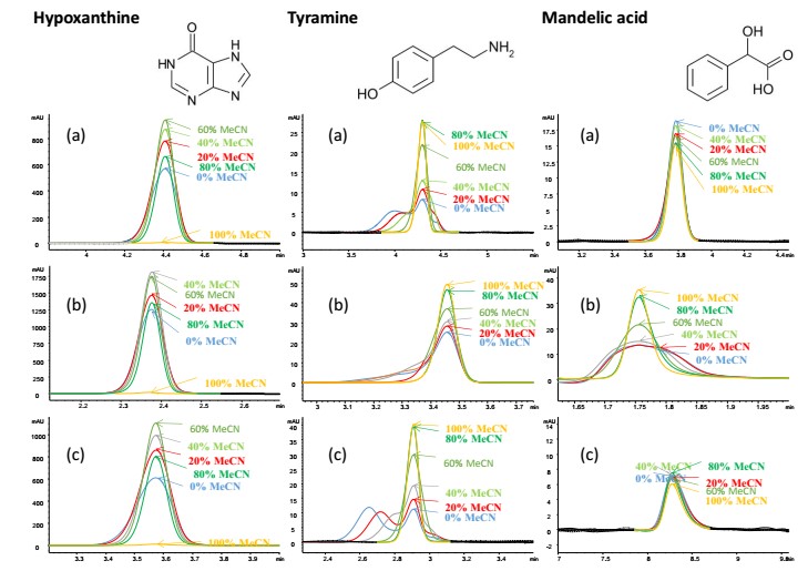 次黄嘌呤(极性中性)的峰形一般随着乙腈浓度的增加而改善,最佳的有机溶剂含量在60-80%左右。酪胺(碱性)在低百分比有机相稀释剂条件下,HILIC-B和HILIC-N上出现分裂峰, HILIC-A峰形很差。当乙腈的浓度大于60%,峰形得到显著的改善。扁桃酸的峰形在HILIC-B和HILIC-N相上受稀释剂的影响较小,而对于HILIC-A相,在高水浓度下峰形较差。总的来说,从这个数据集合来看,对于这个应用,样品推荐使用由60-80%有机相组成的稀释剂。