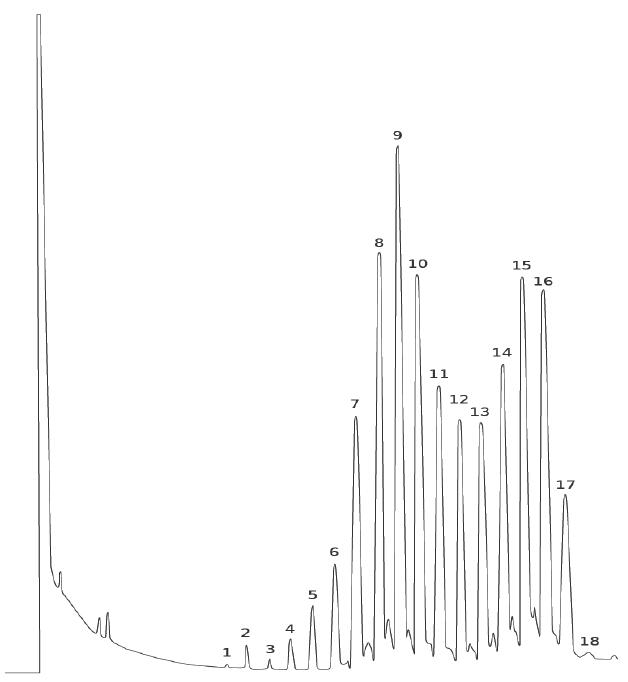 升温程序:60℃ , 15℃ /min, 340℃ 载气:氢气 , 30 kPa