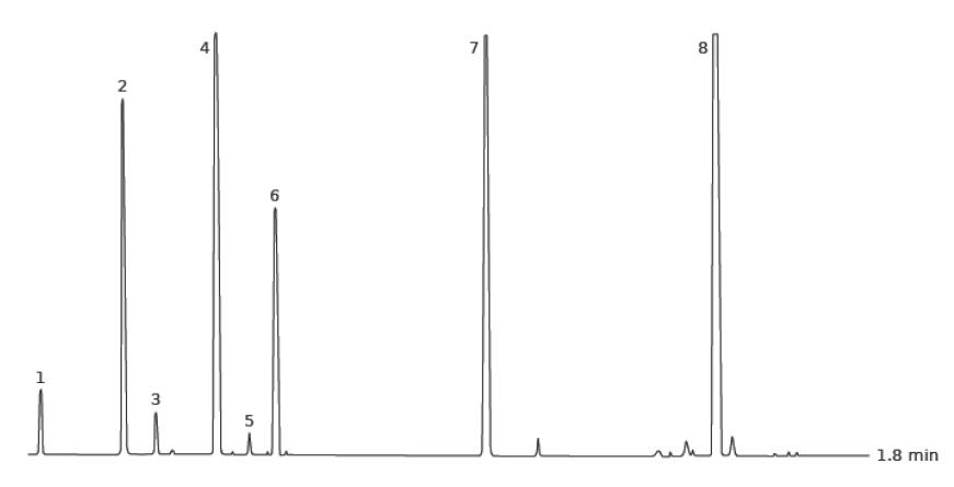 升温程序:50℃ (0.1min), 40℃ /min, 250℃ 样品:用环己烷稀释浓度为 1%