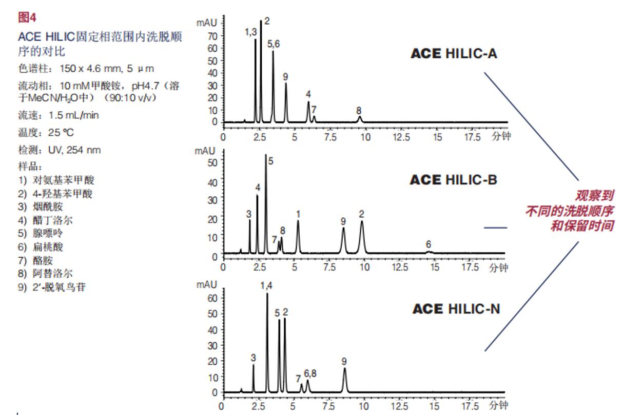 可选择中性或者酸性、碱性都可以。ACE提供市面常见的酸性(Hilic-A)、碱性(Hilic-B)、中性(Hilic-A)三种固定相Hilic色谱柱方法开发包,可作为分析工作者的首选工具。