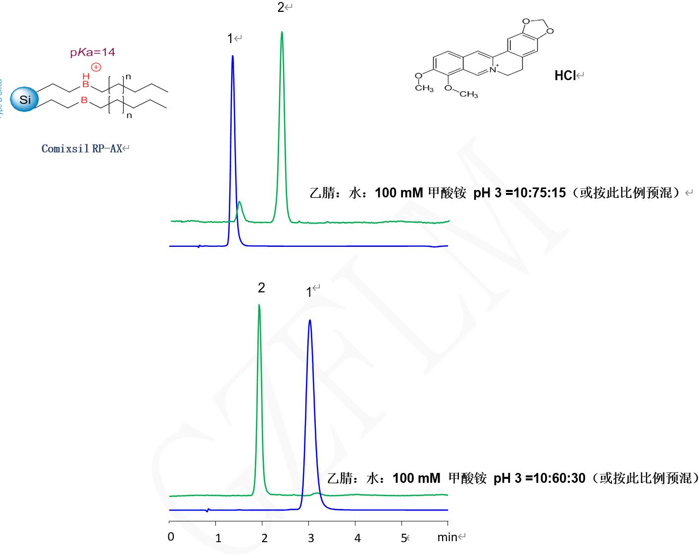 应用说明:此案例利用 Comixsil RP-AX 的疏水长链保留盐酸小檗碱,同时利用阳离子排斥作用,改善带有铵离子的分析物的峰形(此类化合物极易形成拖尾峰形)。