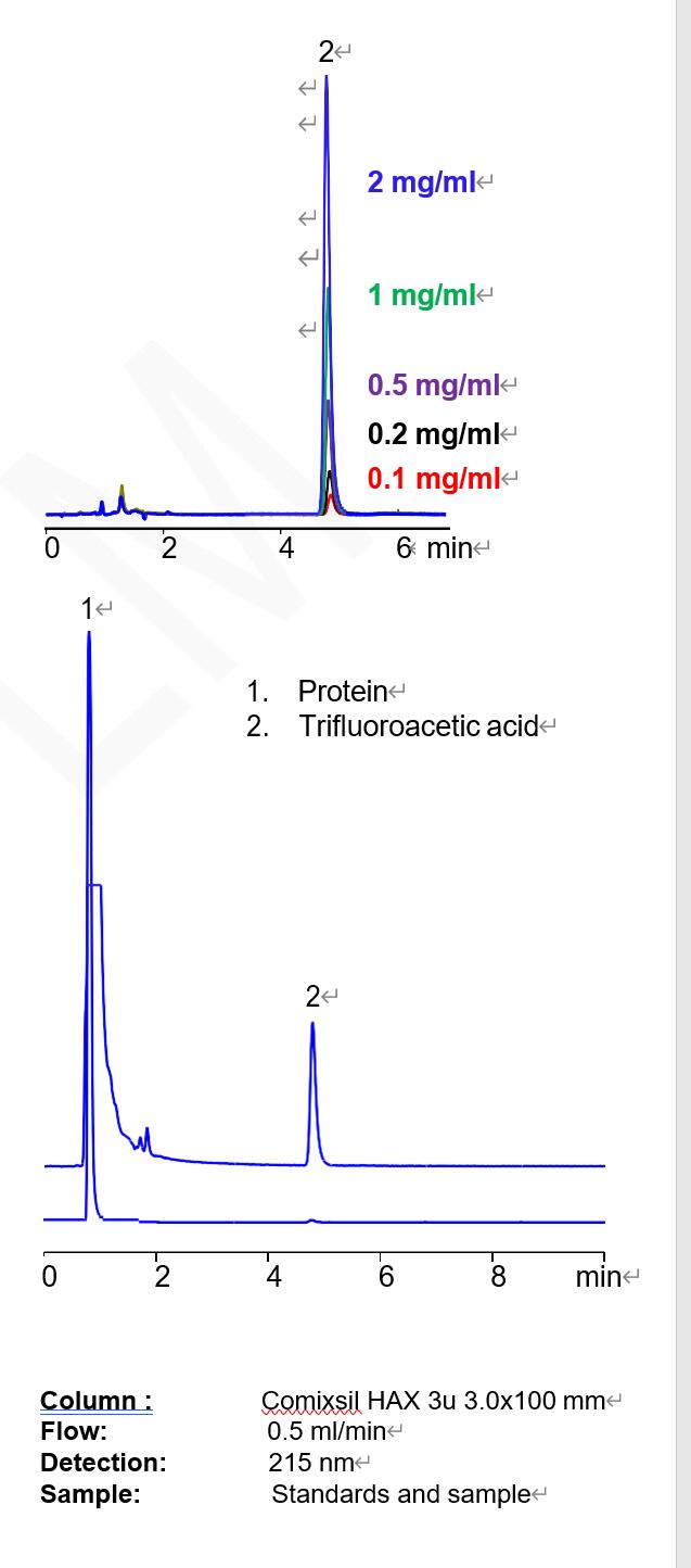 说明:此方法同时适合多肽中TFA残留量的测定。多肽的出峰时间将于蛋白相似或更早, 都不会干扰TFA的定量。此外,UV下的分析,也可采用Comixsil HAX 3u 100*4.6mm