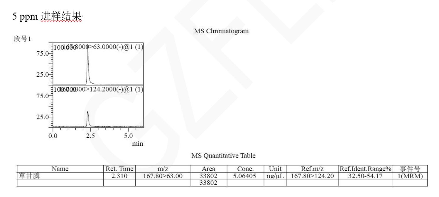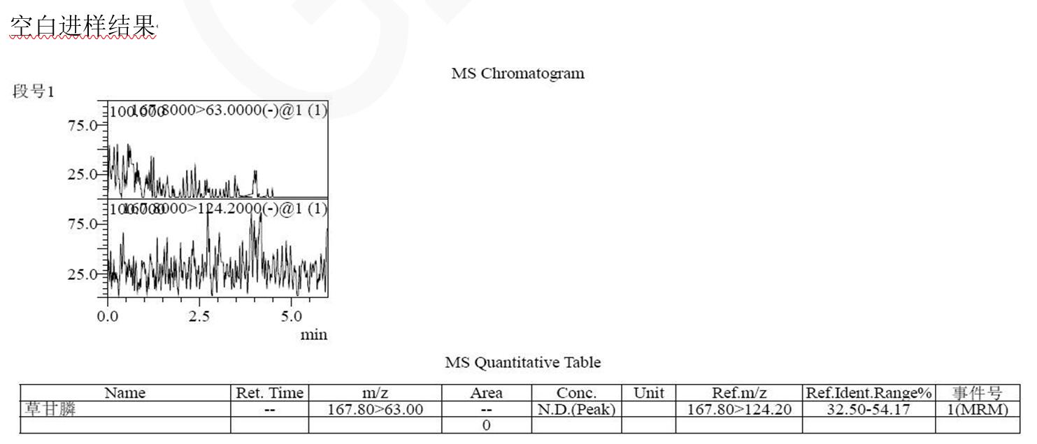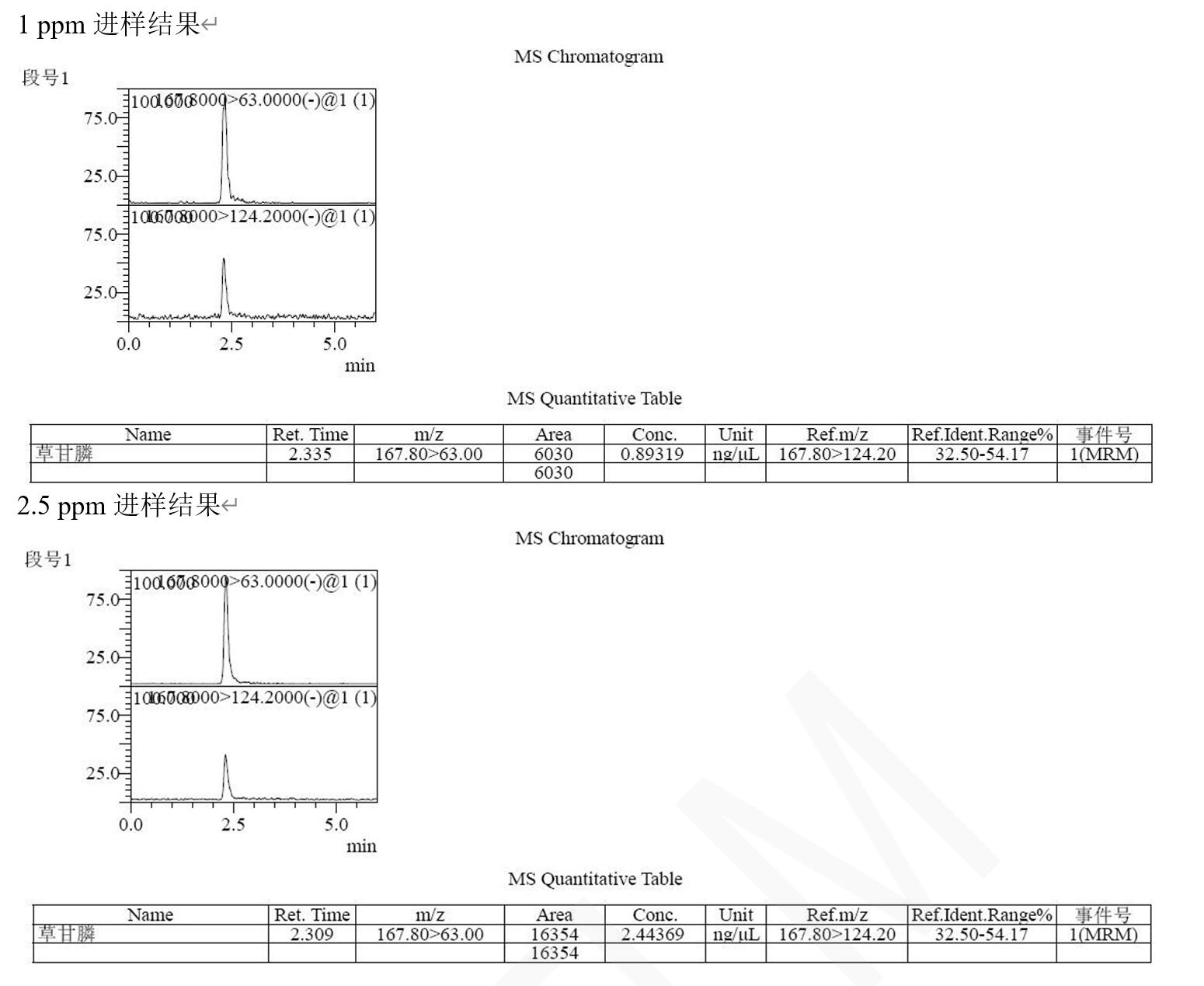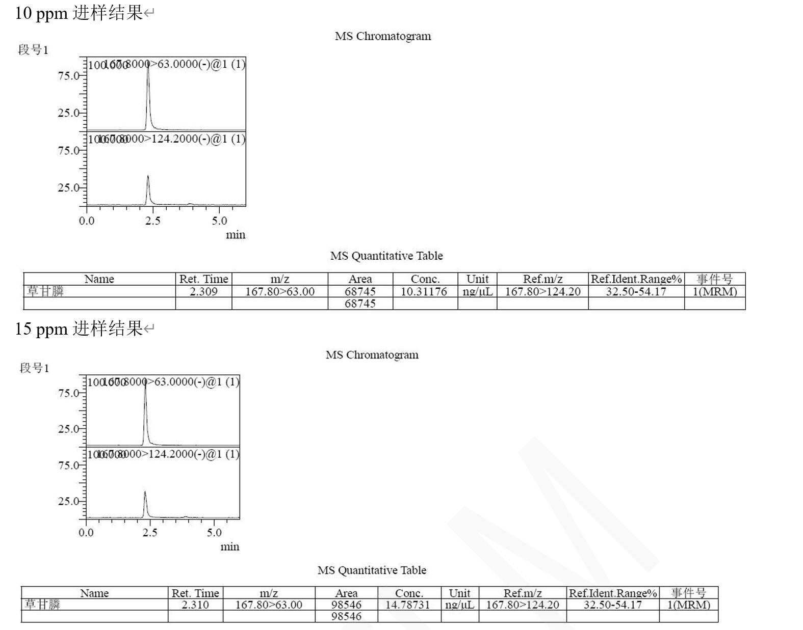说明:本方法研究草甘膦不衍生直接检测。相比于传统衍生后用 C18 分析,或者用氨基柱不衍生 PH=10-11 条件下分析,带来的复杂,耗时,以及氨基柱结果重现与寿命上的问题。此方法简单,快速,方便??陕愠9娣治黾觳庑枨笠约岸嗍辛艏觳庑枨?。
