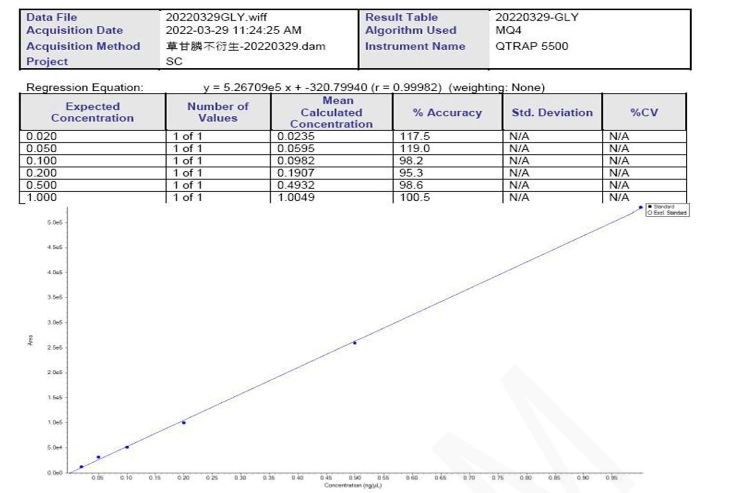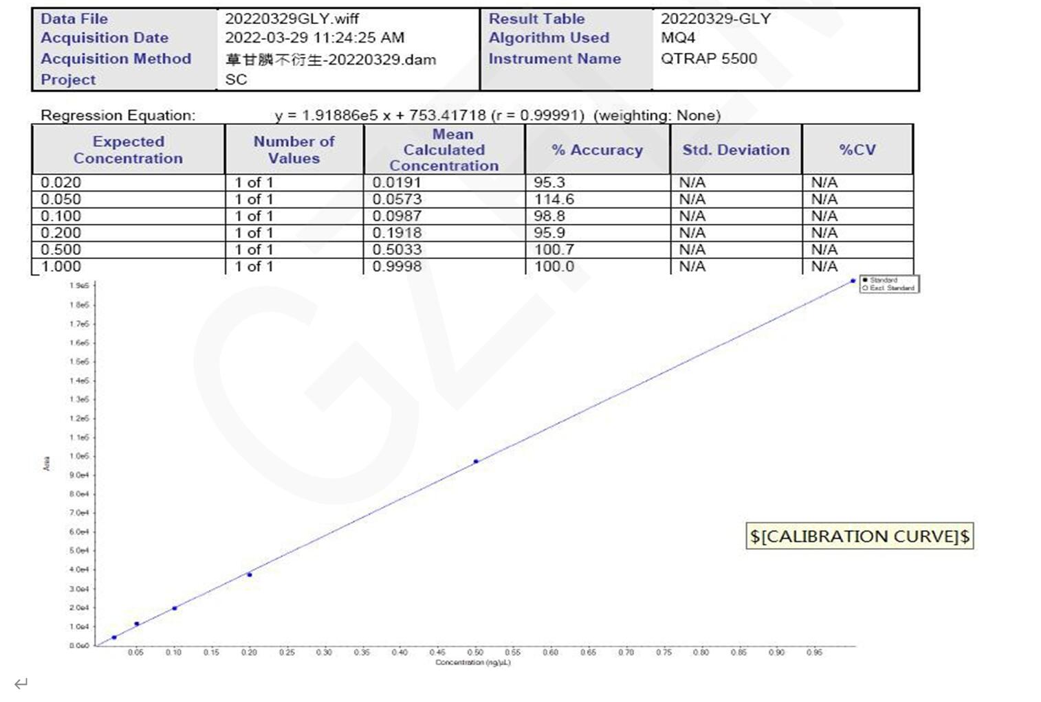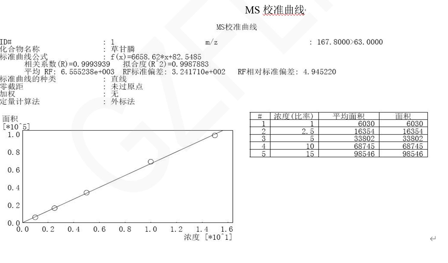 说明:本方法研究草甘膦不衍生直接检测。相比于传统衍生后用 C18 分析,或者用氨基柱不衍生 PH=10-11 条件下分析,带来的复杂,耗时,以及氨基柱结果重现与寿命上的问题。此方法简单,快速,方便??陕愠9娣治黾觳庑枨笠约岸嗍辛艏觳庑枨?。