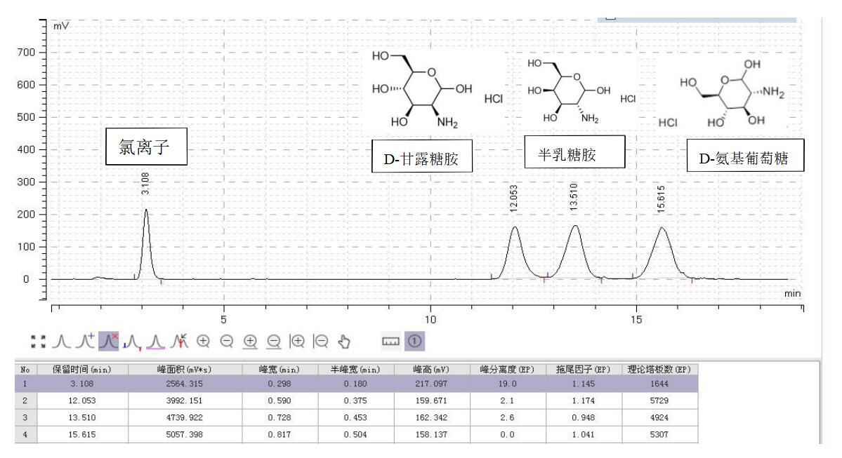 方法说明:半乳糖胺盐酸盐、甘露糖胺盐酸盐、氨基葡萄糖盐酸盐,三者属于同分异构体的氨基糖,用Comixsil HCS 阳离子交换+HILIC 混合模式,在上述条件下可以达到分离目的。