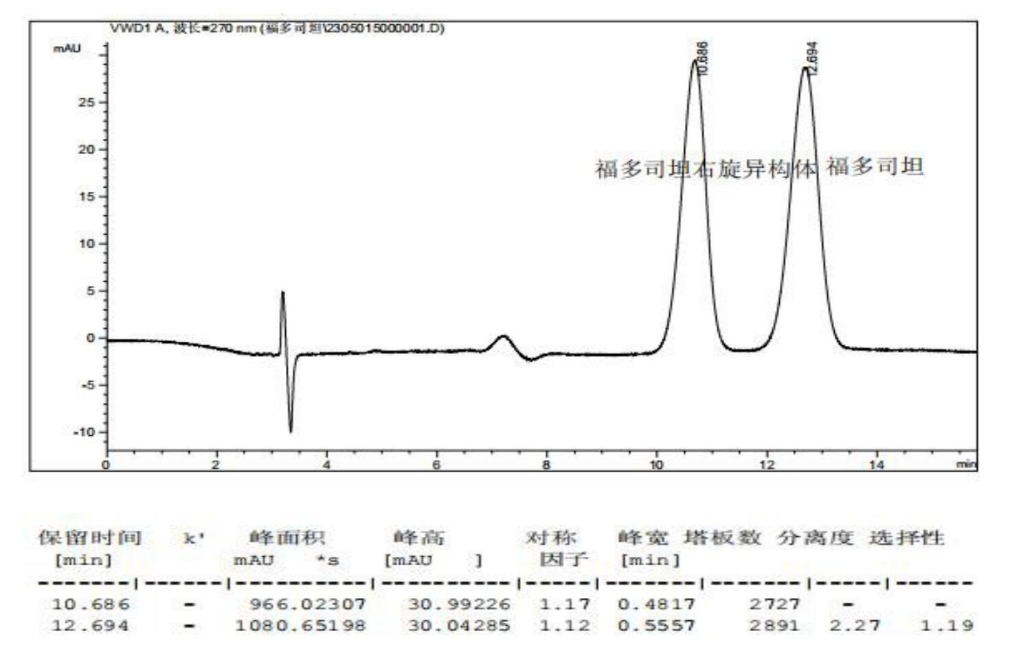 手性HPLC是目前最常用的手性分离方法之一。福多司坦及其右旋异构体可以被固定相为手性固定相的色谱柱有效地分离。手性固体相主要有两种类型:手性小分子和手性高分子。