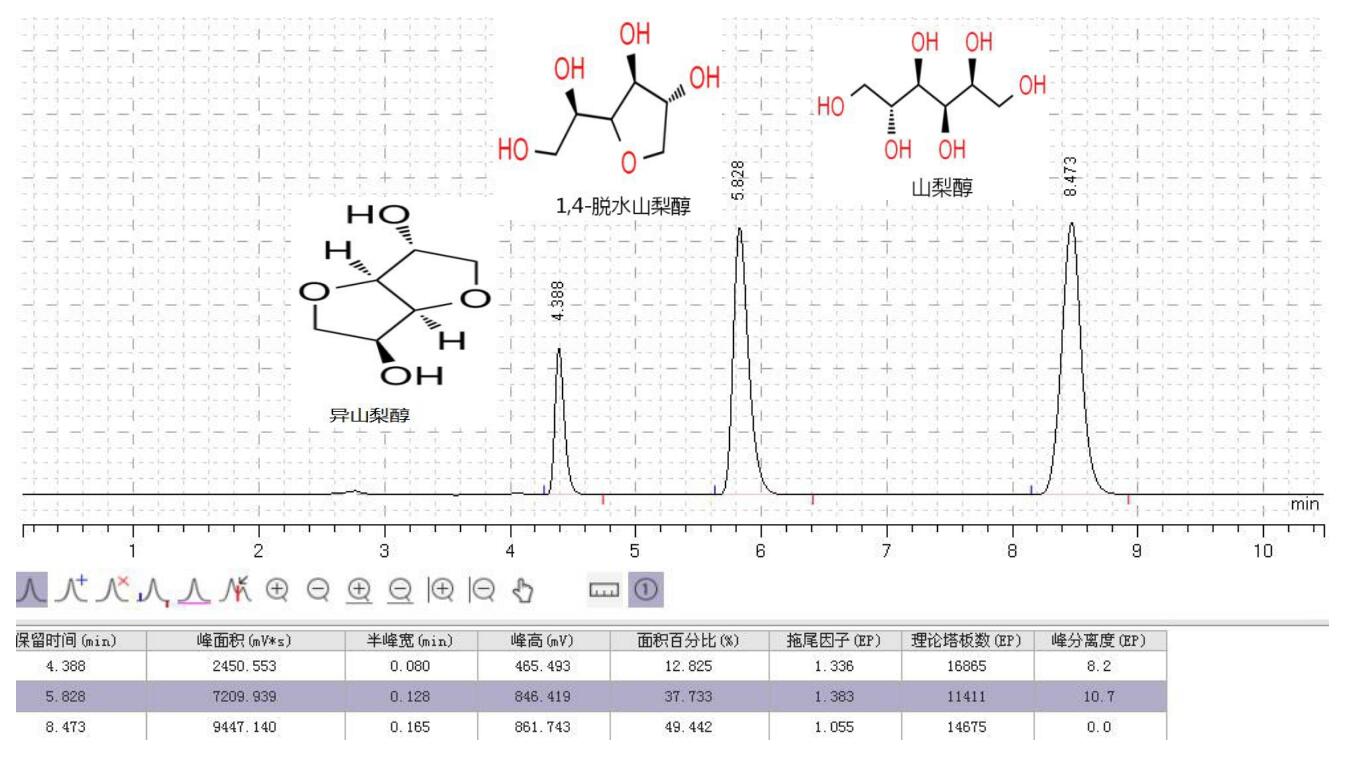 方法说明:使用 Comixsil HCS 可以较好分离山梨醇、异山梨醇、1,4-脱水山梨醇,方法存在调整空间大, 该等度洗脱方法可适用于 RID。