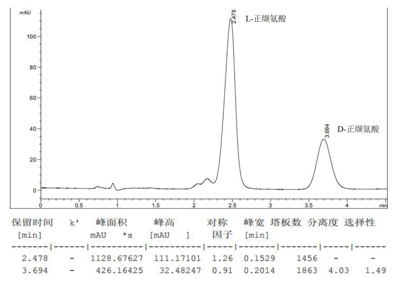 方法说明:使用 Chiral AAOA 可以能够满足 D、L-正缬氨酸的分离;推荐也可使用 Chiral AOAA-L (货号:FMF-AAOAL-EONU)这款手性柱进行分离,出峰顺序会与以上图谱相反,但保留与分离度会更好。