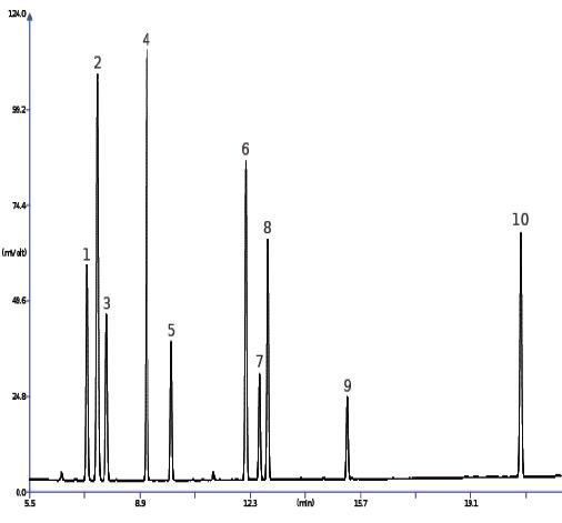 升温程序:40 ℃(2 min), 8 ℃/min, 210 ℃ , 2 ℃/min