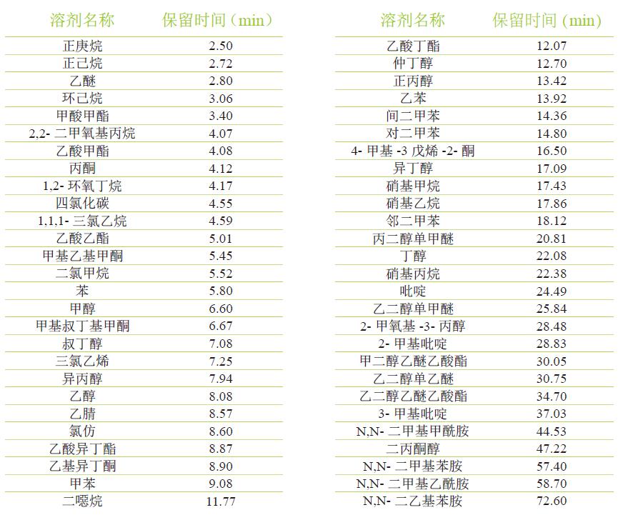54 种溶剂保留时间列表