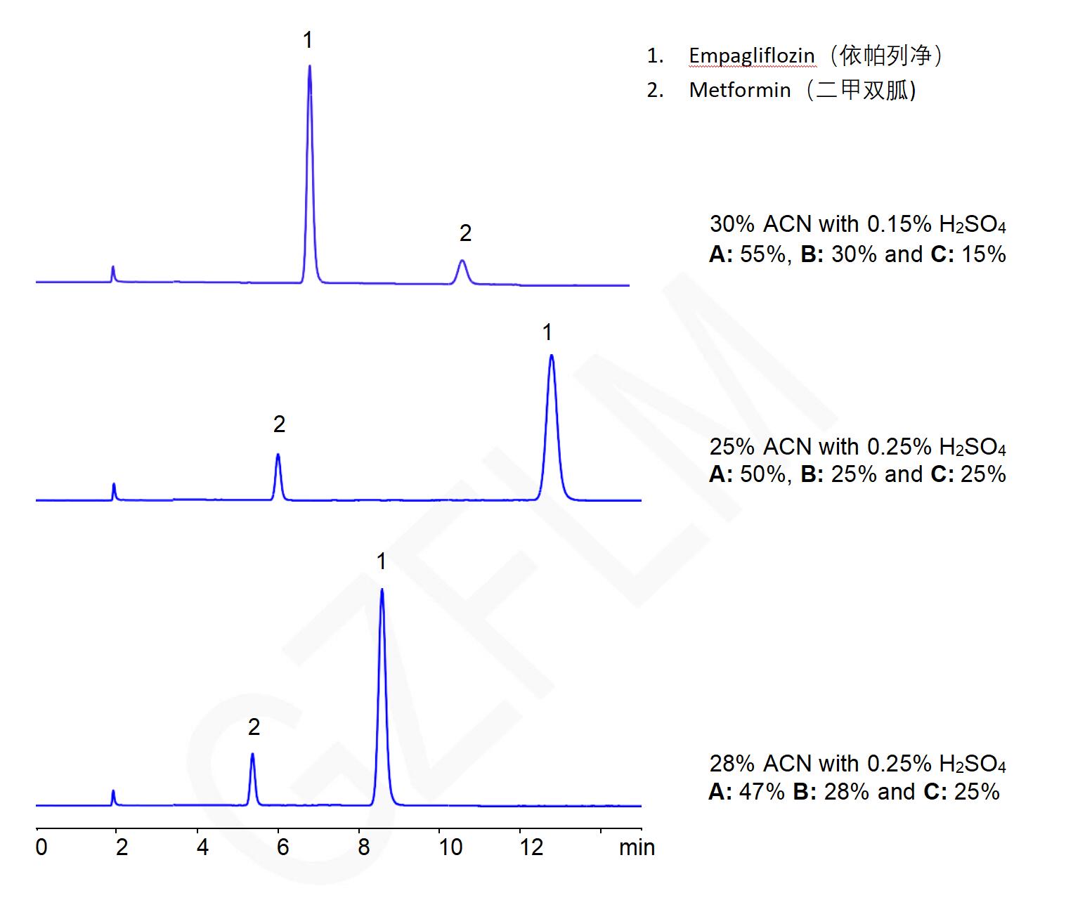 说明:酸强度改变依于阳离子交换的二甲双胍的保留强度。ACN比例决定依于疏水的依帕列净的保留强度。两者调整可以改变两个峰的出峰顺序。
