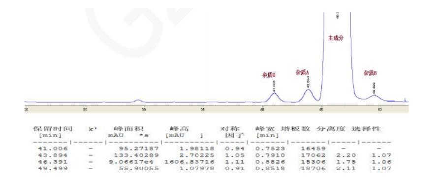 方法说明:使用 Titank F5固定相,可以将布洛芬及杂质 A、B、O 之间分离,升高柱温可有效缩短分析时间,但分离度会有轻微的减小。若采用Titank F5 3u 150*4.6mm(货号:FMF-5564-EONU)柱,将获得更高分离度与柱效。