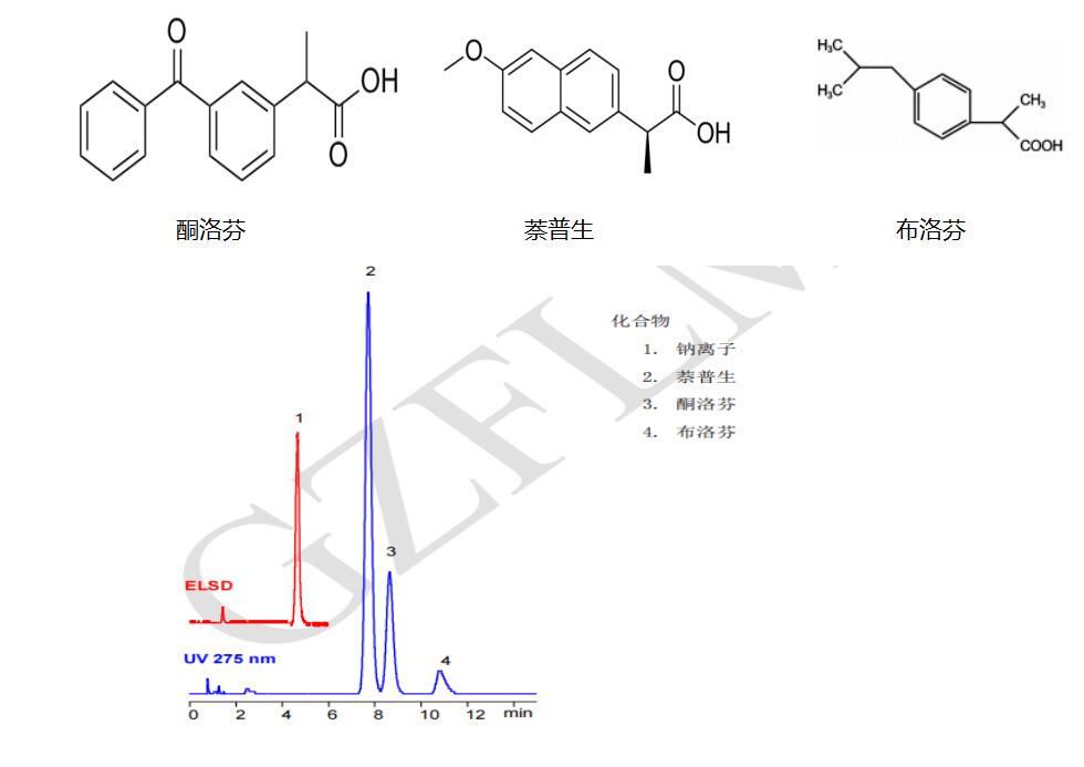 二、布洛芬及其反离子的分析 App ID: FLM-C190066 案例名:酸性药物萘普生、酮洛芬、布洛芬和碱性反离子钠的HPLC分离 方法:自定 色谱柱:Comixsil RPAC 3μm 100×3.0mm (货号:FMD-RPAC3-YONU) 检测:UV 275 nm/ELSD 45°C 流动相:乙腈:50mM 乙酸铵(pH 5):水 =(70:20:10)