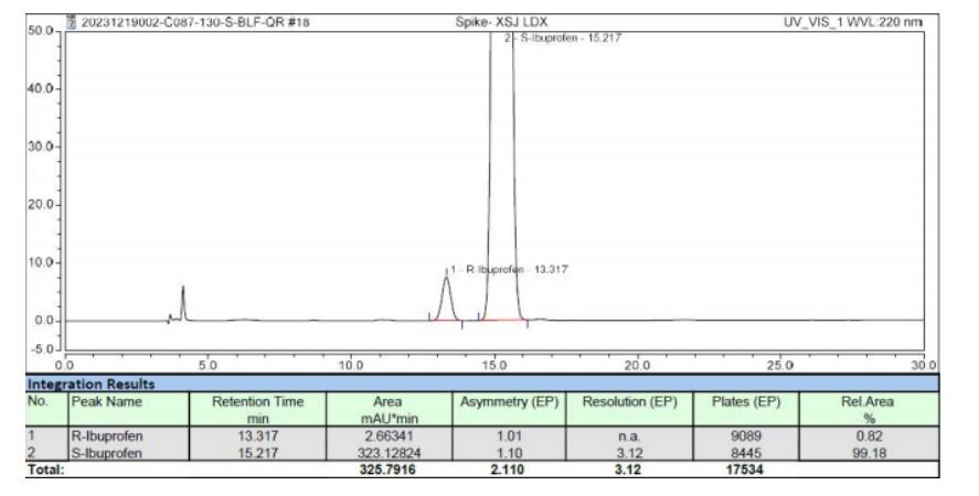 方法说明:该款反相手性色谱柱相比其它的正相方法,采用简单的反相流动相体系,更为实用方便。峰形对称,柱效高。药典要求理论板数按右布洛芬峰计算不低于 2000,右布洛芬峰与左布洛芬峰之间的分离度应大于3.0,此反相方法也完全符合药典的指标要求。