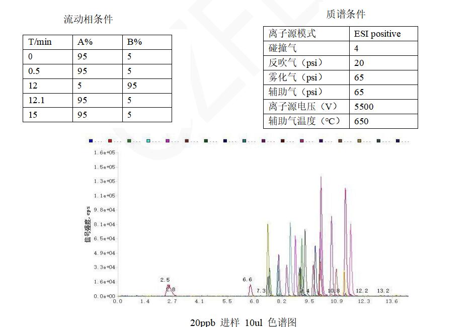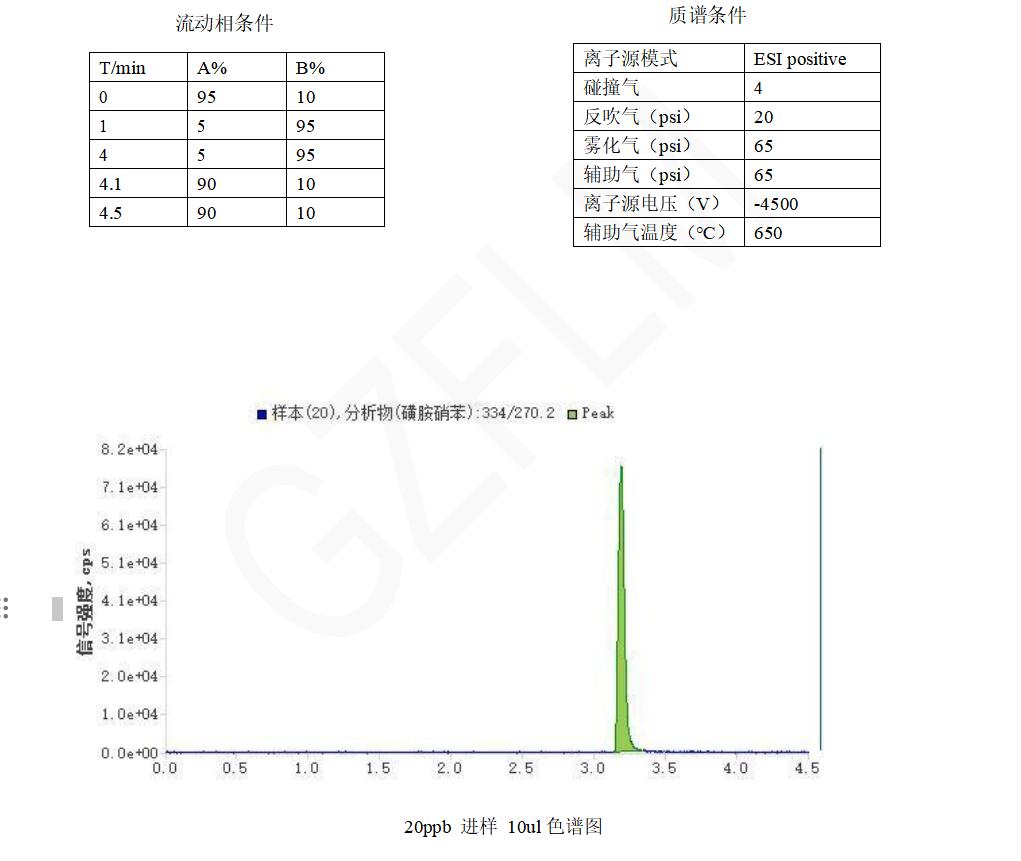 App ID:FLM-T240005 磺胺脒、磺胺醋酰、磺胺嘧啶等 23 种磺胺测定 色谱柱:Titank C18 1.8u 100*2.1mm( FMD-5558-BONU) 流动相 A:0.1%甲酸水 流动相 B:甲醇流速:0.25ml/min 进样体积:10μl 柱温: 35℃ 仪器: 广州质谱技术有限公司 LCMS-TQ480 三重四极杆串联质谱仪; 广州质谱技术有限公司 UPLC-480 超高效液相仪; 标准物质:磺胺 23 项混标:包含磺胺脒、磺胺醋酰、磺胺嘧啶、磺胺二甲嘧啶、磺胺索嘧啶、磺胺噻唑、磺胺吡啶、磺胺甲嘧啶、磺胺甲氧嗪、甲氧苄啶、磺胺甲二唑、磺胺对甲氧嘧啶、磺胺氯哒嗪、磺胺甲恶唑、磺胺间甲氧嘧啶、磺胺多辛、磺胺异恶唑、磺胺恶唑、磺胺苯酰、磺胺苯吡唑、磺胺间二甲氧嘧啶、磺胺喹 恶啉、磺胺硝苯,由甲醇配制,浓度为 1ppm;磺胺 22 种(正离子模式)