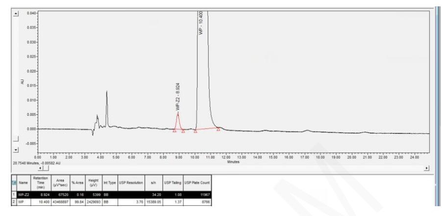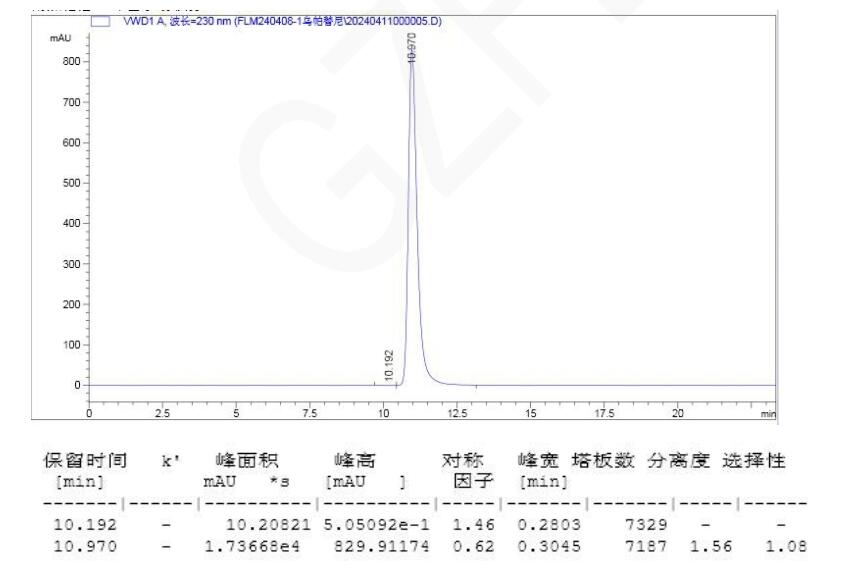 因此,为了确保乌帕替尼手性拆分的准确性和有效性,建议在专业的实验室或药物研发机构进行,并由具有相关经验和技能的专业人员操作。这样不仅可以确保拆分过程的顺利进行,还可以保证拆分后得到的对映体的纯度和活性满足药物研发和生产的需要。 App ID: FLM-B240004 乌帕替尼手性拆分 色谱柱:Chiral MZ(2)-RH 3μ 250*4.6mm (货号:FMG-AC3-B02-R) 流动相:反相 (详询销售代表) 流速:0.8 mL/min 检测波长:230nm 柱温:30℃ 样品浓度:0.5mg/mL (异构体含量约 0.1%以下和异构体含量 0.15%) 稀释剂(乙腈:水-30:70) 进样量:10ul 色谱图 1:(低于 0.1%限度)