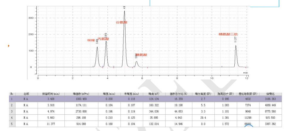 方法说明:本应用参照 FLM-C190005《Comixsil HCS 柱分析 18 种非衍生氨基酸》,为洗脱保留较强的精氨酸三肽进行了微调。各化合物峰之间分离度大,柱效优秀。 |