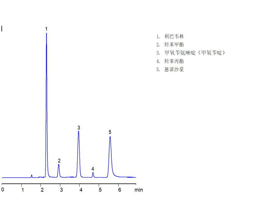 App ID: FLM-C240007 Comixsil RP-100 同时分析抗病毒药物利巴韦林甲氧苄啶恩诺沙星羟苯甲酯 的检测 色谱柱:Comisil RP-100 3u 150*4.6mm(货号:FMF-100R3-EONU) 流速:1 mL/min 检测:UV 215nm 流动相:ACN:0.3%H2SO4 = 50:50