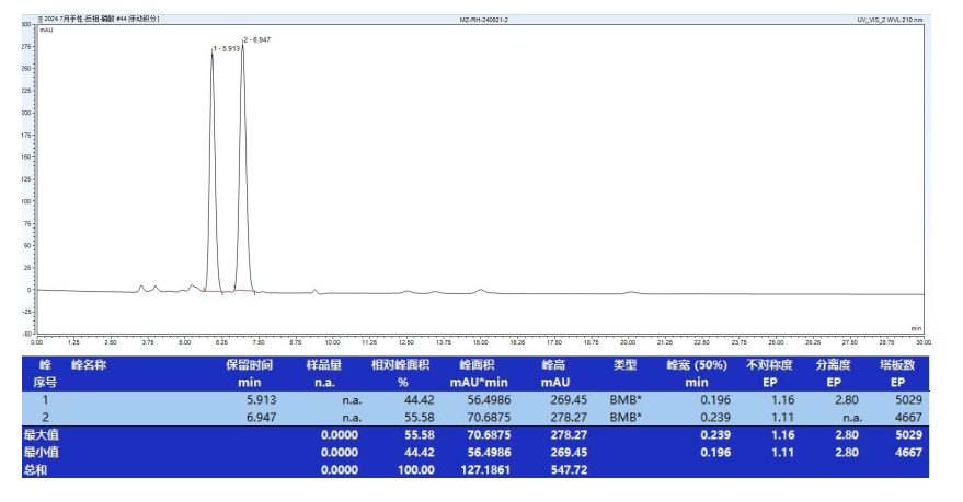 App ID: FLM-B240008 Chiral MZ(2)-RH 手性柱对阿瑞匹坦对映异构体检测 方法:自定 色谱柱:Chiral MZ(2)-RH 5u 250*4.6mm (货号:FMG-AC5-B02-R) 流速:0.8 mL/min 检测:UV210nm, 25oC 样品浓度:1 mg/mL 进样量:3 μL 溶剂:异丙醇 色谱图: