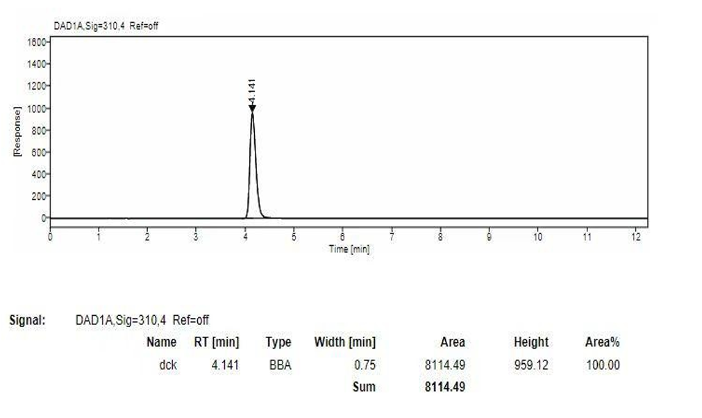 App ID: FLM-T240011 Titank C18 柱对敌草快二氯盐、烯酰吗啉、苯嘧磺草胺检测 方法:CCPIA 团体标准 T/CCPIA 217—2023 色谱柱:Titank C18 5μm 150×4.6 mm (货号:FMF-5560-EONU) 柱温:25C° 流速:1ml/min 敌草二绿盐: 流动相:乙腈:庚烷磺酸钠=10:90 波长:310nm 色谱图: