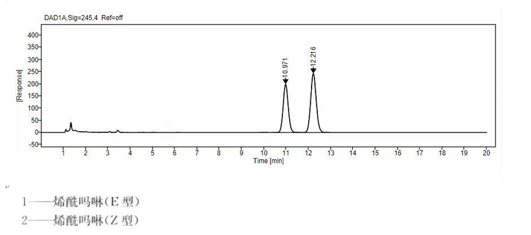 烯酰吗啉: 流动相:乙腈:0.1%磷酸水=40:60 波长:254nm 色谱图: