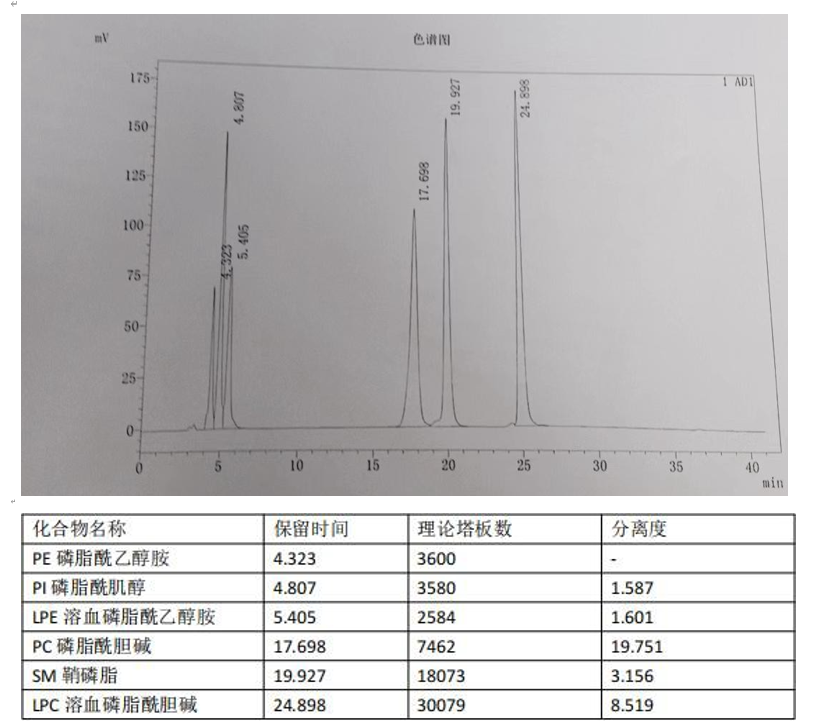 App ID: FLM-S250002 Superlu Silica 柱对大豆磷脂的检测 方法:中国药典第四部 色谱柱:Superlu Silica 5u 250*4.6mm(货号:FMG-5274-EONU) 检测:流速 1ml/min,ELSD, 柱温 40°C(参考条件:漂移 管温度为 72℃;载气流量为每分钟 2.0L) 流动相: