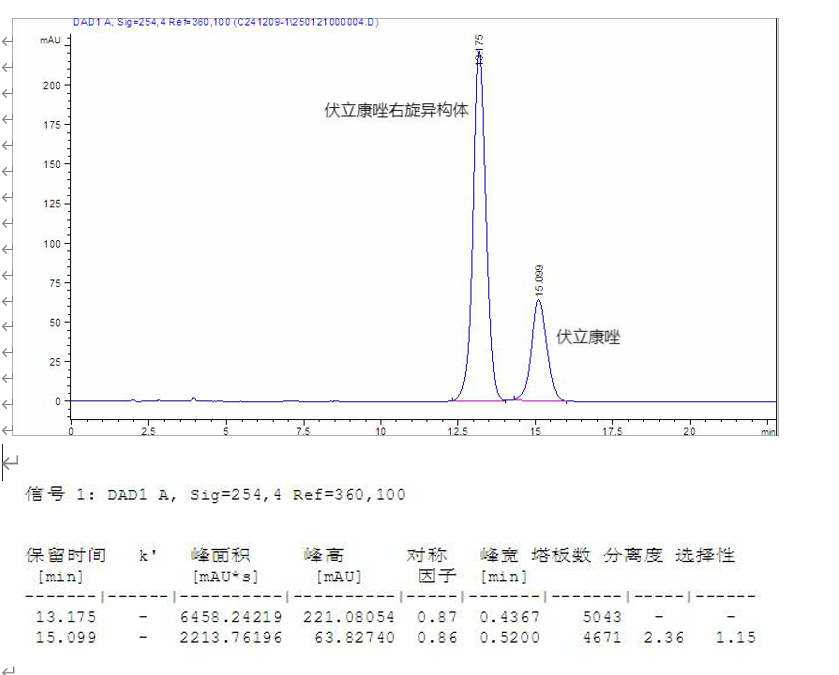 App ID: FLM-B250003 伏立康唑及对映异构体的手性拆分 色谱柱:Chiral INC 5um 150*4.6mm (货号:FMF-JY5-I03) 流速:1 mL/min 检测:UV254nm, 25oC 样品浓度:2mg/mL 进样量:10 μ 溶剂:水 流动相:反相(咨询) 色谱图: