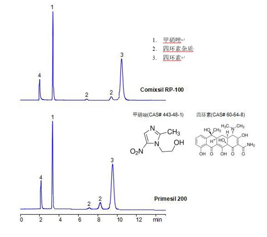 App ID: FLM-C250006 Comixsil RP-100 与 Primesil 200 分析甲硝唑与四环素 色谱柱:Comixsil RP-100 与 Primesil 200 规格:3μm 150×4.6 mm 流动相:乙腈:水:200mM 磷酸氢二铵(pH2.0 ) = 20:40:40 流速:1 mL/min 检测波长:220nm 柱温:25℃ 色谱图:
