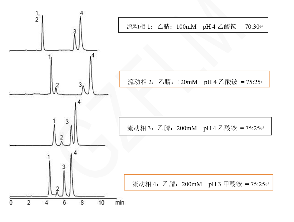 * 流动相的选择:通过试验不同的溶剂系统和比例,找到能够同时分离这四种物质的最佳流动相。 * 柱温和流速的调整:根据物质的保留行为和分离效果,调整柱温和流速以优化分离效果。 * 检测波长的选择:如果采用紫外检测器,需要选择适合待测物质的检测波长。