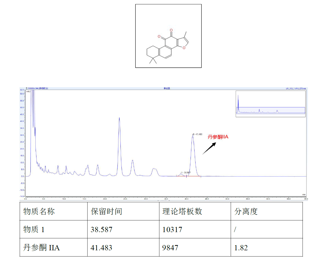 App ID: FLM-T250002 Titank 18 对复方丹参片的丹参中的丹参酮IIA 含量测定 方法:《中国药典》2020 版一部 色谱柱:Titank C18 5μ 250x4.6mm(货号:FMG-5560-EONU) 流速:1mL/min 检测:UV 270nm 柱温:25oC 样品浓度:根据药典配制 进样量:10uL 流动相:甲醇:水(73:27) 色谱图:
