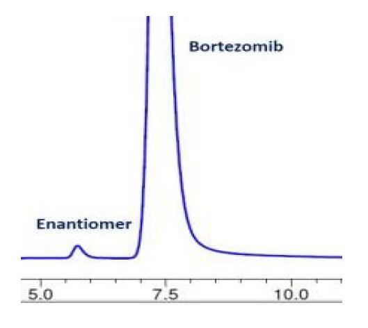 App ID: FLM-B250013 硼替佐米的手性分析 色谱柱:Chiral IND 3μm 250×4.6 mm 货号:FMG-JY3-I04 流速:1 mL/min 检测:UV270nm 柱温:25°C 样品浓度:1 mg/mL 进样量:5 μ 流动相:咨询 色谱图: