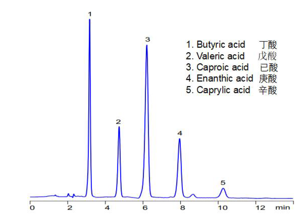 App ID: FLM-C250012 Comixsil RP-100 HPLC-UV 法直接分析有机酸-丁酸戊酸已酸庚酸辛酸 色谱柱:Comixsil RP-100 3μ 150x4.6mm 货号:FMF-100R3-EONU 流速:1mL/min 检测:UV 210nm 柱温:25℃ 进样量:5μL 流动相:乙腈:水:硫酸(20%:75%:5%) 色谱图: