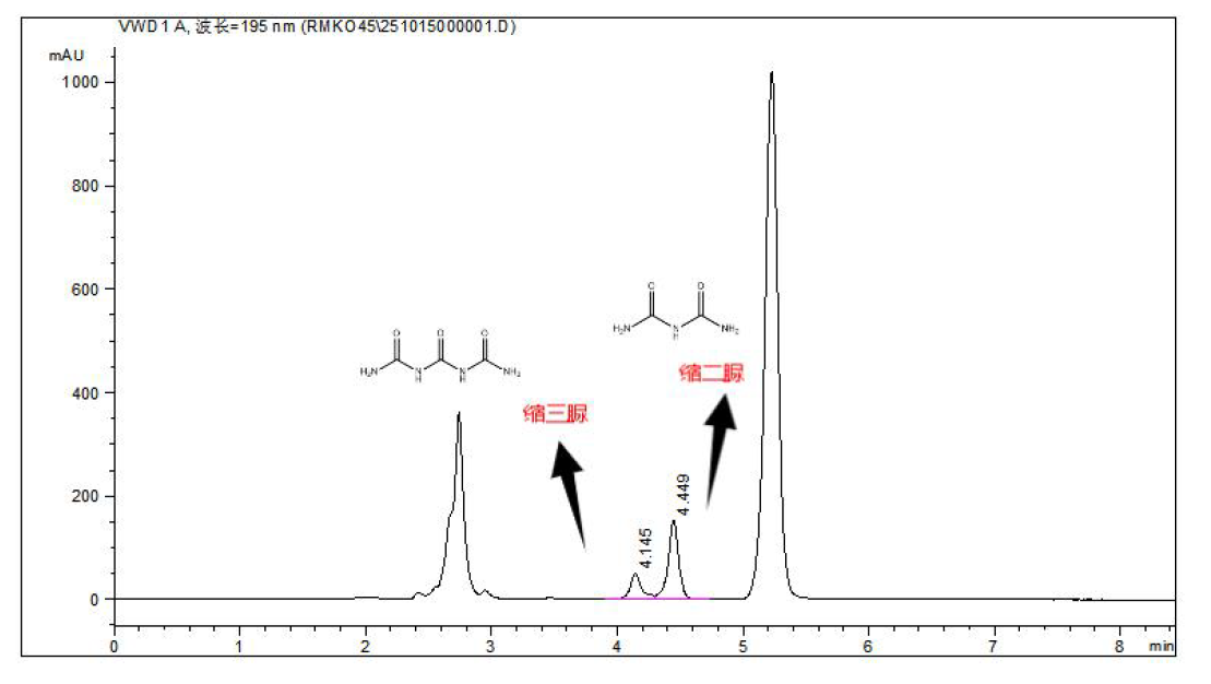 App ID: FLM-N250001 Neptune NH2 色谱柱对缩三脲和缩二脲的检测 色谱柱: Neptune NH2 5μ 250×4.6mm 货号:FMG-5378-EONU 流速:1mL/min 检测:UV 195nm 25℃ 样品浓度:N/A 进样量:10uL 流动相:乙腈:水(75:25) 色谱图: