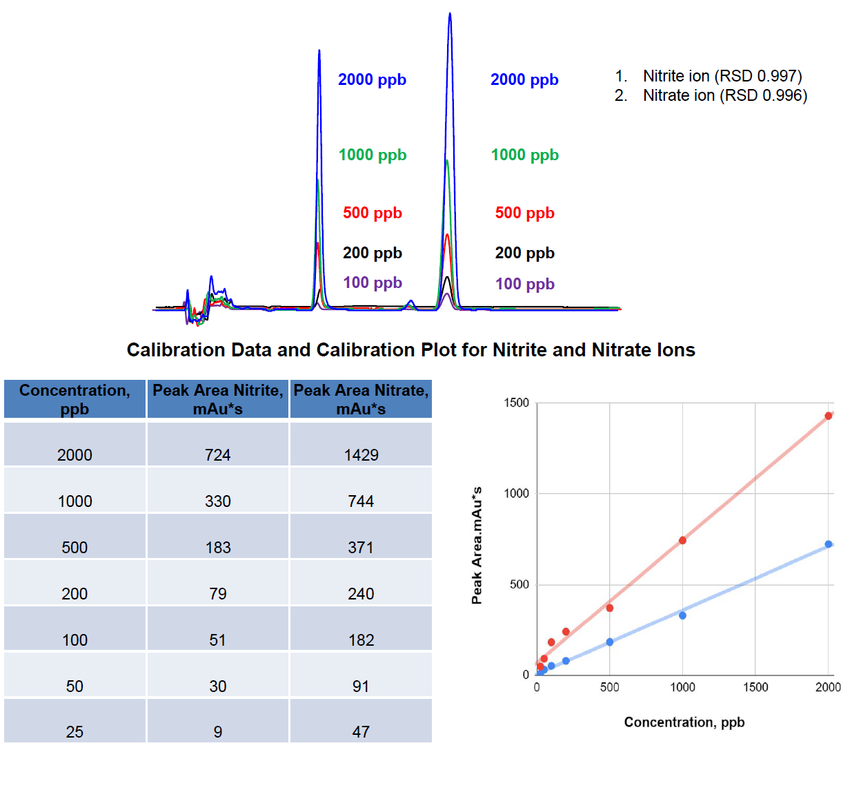 App ID: FLM-C230015 Comixsil HAX基于UV检测器对于样品中亚硝酸根与硝酸根离子的定量线性研究 Column: Comixsil HAX 3u 100*3.0mm (P/N: FMD-HAX3-YONU) Mobile phase: 60% ACN with 10 mM ammonium phosphate pH 3 A: Water (35%), B: ACN (60%), C: 200 mM AmPh pH 3 (5%) Flow rate: 0.6 ml/min Detection: 210nm Samples: 25-2000 ppb (each) Injection: 50 uL