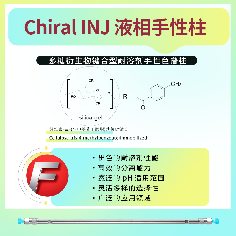 Chiral INJ 键合型耐溶剂手性柱的固定相为纤维素-三-(4-甲基苯甲酸酯)共价键键合(Cellulose tris(4-methylbenzoate)immobilized)。这种设计使得该手性柱具有出色的手性识别能力和耐溶剂性,能够在广泛的溶解条件下使用,包括各种互溶的溶剂作为流动相、溶解样品以及手性柱再生。