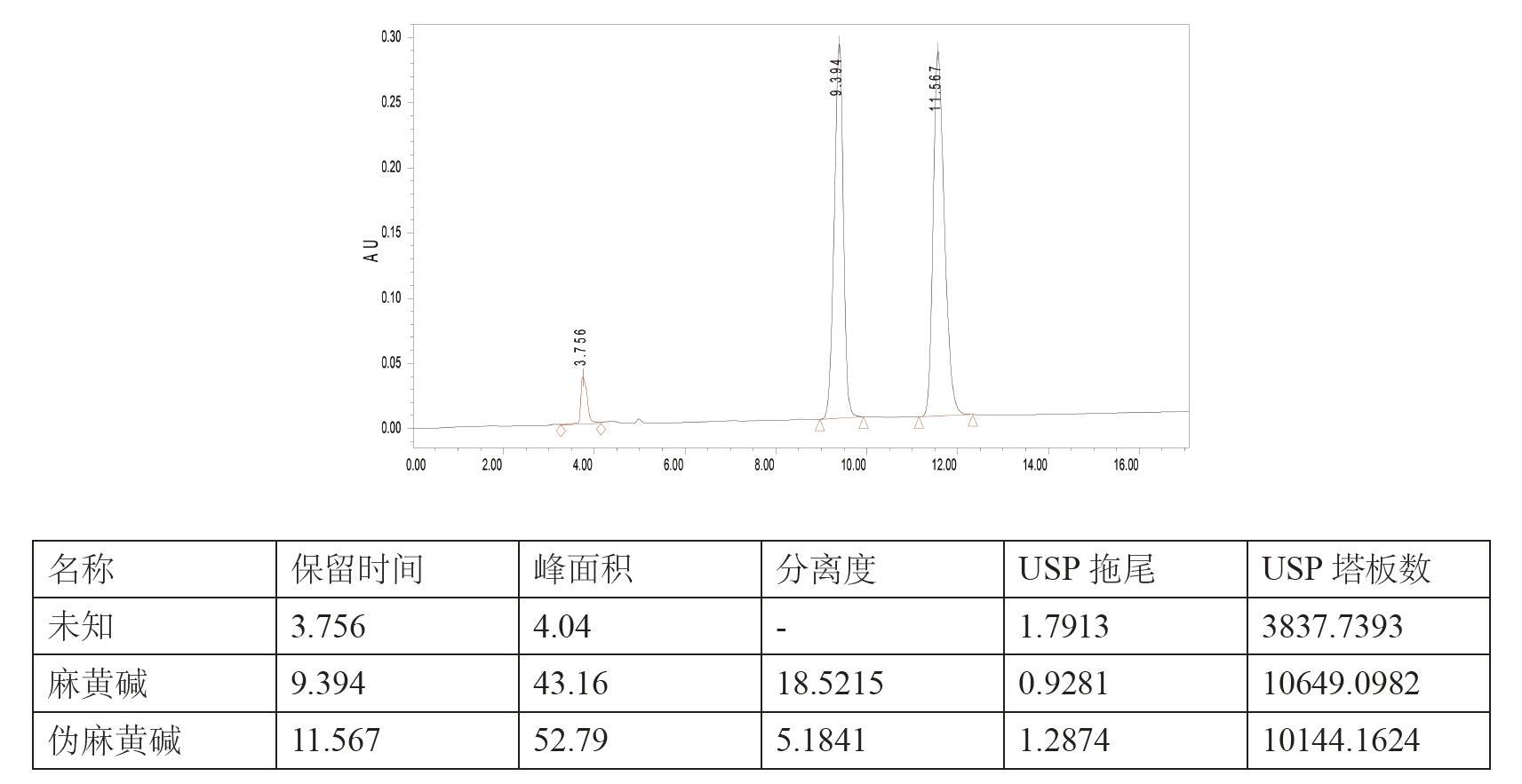 参照 2015 版中国药典麻黄检测色谱条件:以极性乙醚连接苯基键合硅胶为填充剂;以甲醇-0.092% 磷酸溶液(含0.04% 三乙胺和 0.02% 二正丁胺)(1.5: 98.5)为流动相;检测波长 210 nm;理论塔板数按盐酸麻黄碱峰计算应不低于3000。