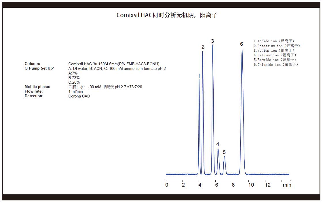 Comixsil HAC分离氨基糖苷类的链霉素与双氢链霉素 Comixsil HAC分析8种氨基糖苷物质 Comixsil HAC分离11种核酸碱基与核苷(MS匹配) Comixsil HAC 液相方法分离钙与锌离子 Comixsil HAC同时分析锌钙铜等金属离子及相应的阴离子