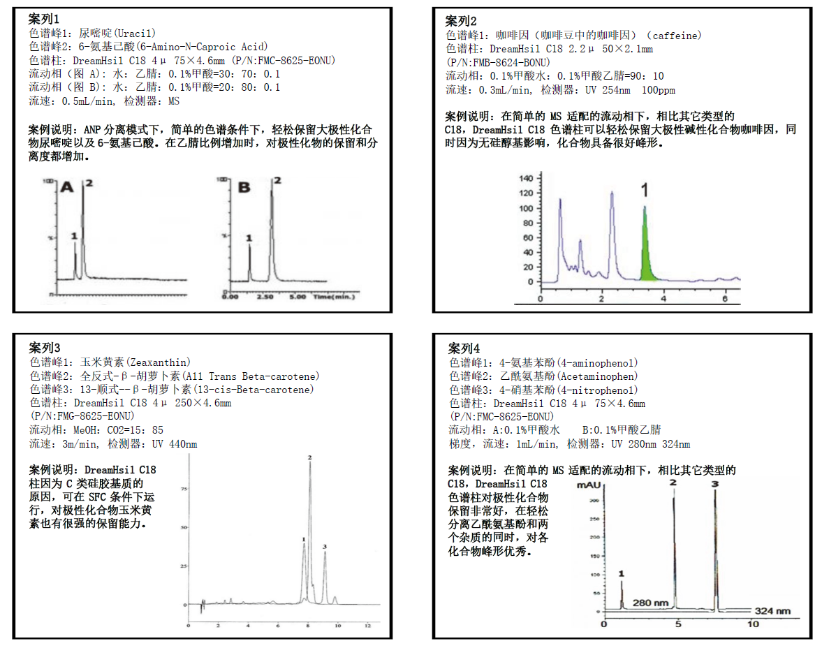 此固定相可以在100%水相和100%有机相下使用。它最大的用途是在反相模式下。该固定相是疏水性很强的固定相,相比一般的B类硅胶C18,有更强的疏水分离能力。 当它在高水或纯水条件下使用时,对极性的酸、碱化合物有很好的选择性,并不需要在此柱上采用 ANP 模式。 此固定相可承受各种溶剂在流动相中的添加,不易被离子对改性。 DreamHsil C18可以作为实验室的强有力工具因为它相比B 类的 C18 更稳定更耐用。它归属于USP L1 的分类??梢杂糜谌〈切┰谄渌嘈虲18 上,方法不稳定,含离子对试剂方法的应用。