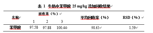 表 1 牛奶中苯甲酸 25 mg/kg 添加回收结果