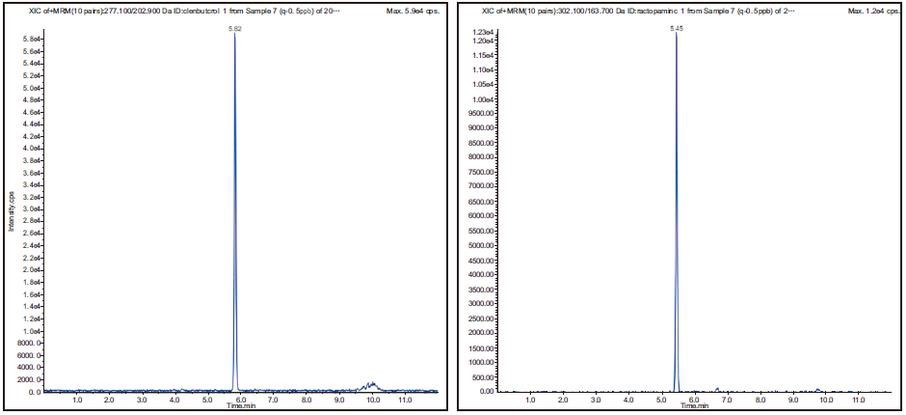 图 3 克伦特罗(clenbutecol)(277.1/202.9)色谱图 图 4 莱克多巴胺(ractopamine)(302.1/163.7)色谱图