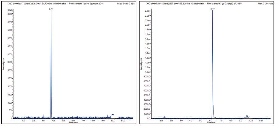 图 5 特布他林(terbutaline)(226.0/151.7)色谱图 图 6 妥布特罗(tulcbutclol)(227.9/153.8)色谱图