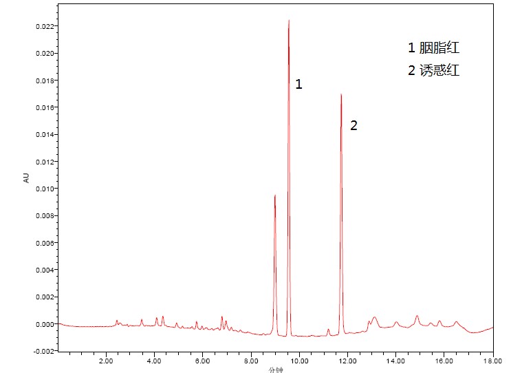2、添加水平为 0.2 mg/kg 火腿中胭脂红和诱惑红检测的液相色谱图