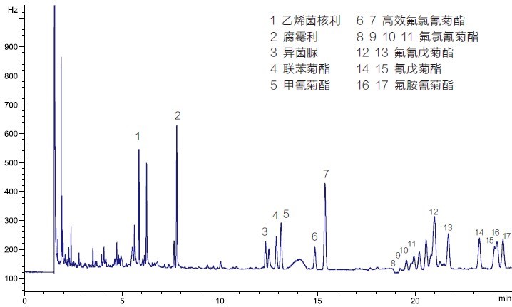 图 1 添加水平为 0.25 mg/kg 普洱中有机氯和拟除虫菊酯类农药多残留检测色谱图