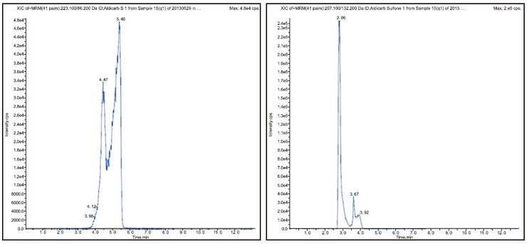 图 3 涕灭威砜(Aldicarb S)(223.1/86.2)质谱图 图 4 涕灭威亚砜(Aldicarb Sulfone)(207.1/132.2)质谱图