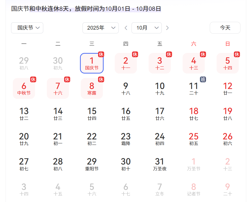 国庆节、中秋节:10月1日(周三)至8日(周三)放假调休,共8天。 9月28日(周日)、10月11日(周六)上班。