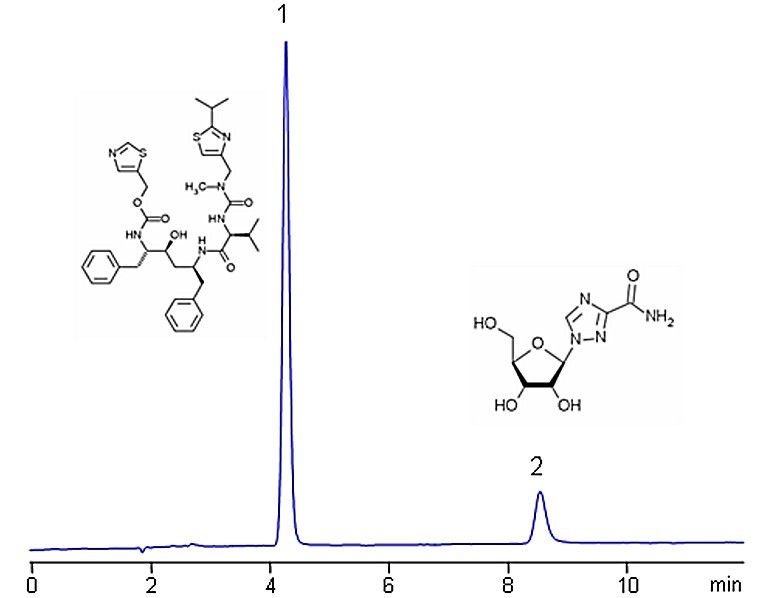 利托那韦是一种抗逆转录病毒药物,属于蛋白酶抑制剂类,用于治疗 HIV 感染和 AIDS。利托那韦具有强疏水性且不可电离,它在反相色谱上保留过强。利巴韦林是一种抗病毒药物, 可以有效对抗许多 DNA 和 RNA 病毒。利巴韦林属于核苷酸抗代谢药物,具有强亲水性。对于 HPLC 分离,利托那韦和利巴韦林是两种性质差异非常大的药物??梢圆捎们姿饔蒙祝?在 Primesep N 上对强疏水和强亲水药物进行分离。
