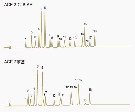 C18-AR可能具有其它不同的分离机制,可以为复杂的混合物带来更好的分离效果。对于其他混合物,可能不是这种情况,这是ACE键合相的优势。
