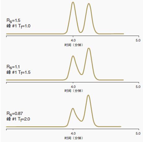 随着峰拖尾(Tf,拖尾因子)从1.0增加到2.0,分离度(Rs)从1.5下降到0.87。