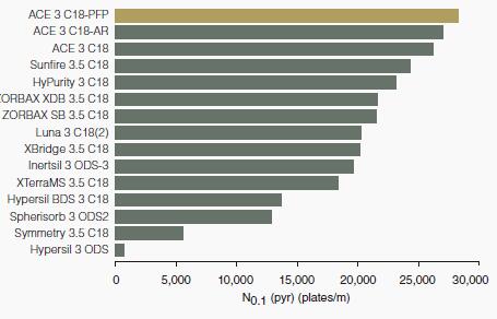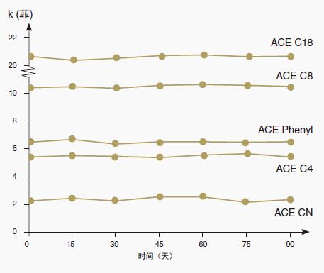 尽管所有ACE键合相的稳定性都很优异,但是一些键合相并不像其它键合相那样稳定。例如,通常认为C18键合比柱长较短的烷基相、PFP相和苯基键合相更稳定。