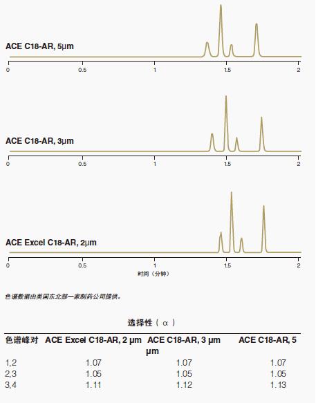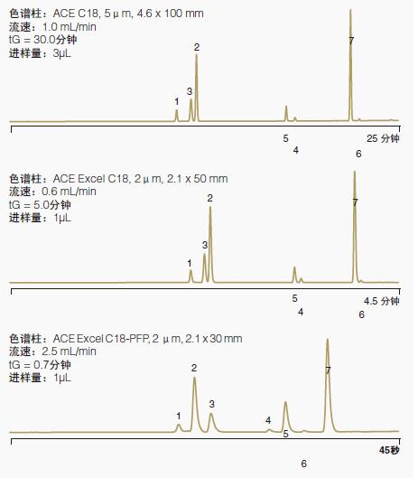 试验样品的这些色谱图在ACE Excel C18 2μmUHPLC色谱柱、ACE C18 3μmHPLC色谱柱和ACE C185μm色谱柱上以相同的流动相条件运行,结果阐明ACE固定相的选择性一致,无论填充粒径如何。